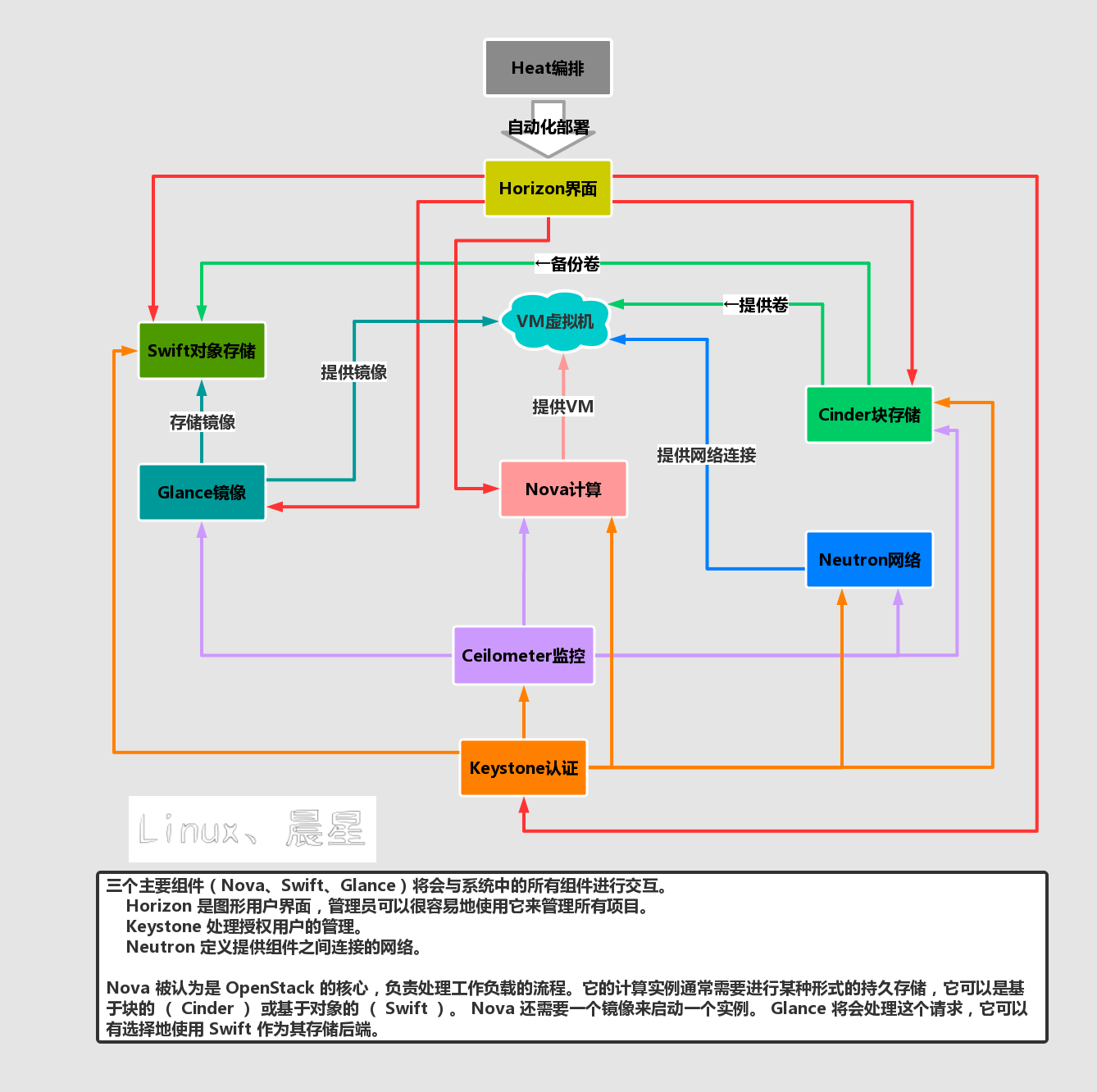 | 编排服务 | Heat | 为OpenStack编排服务,基于模板自动化部署服务,属于高级服务。 |