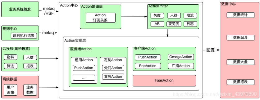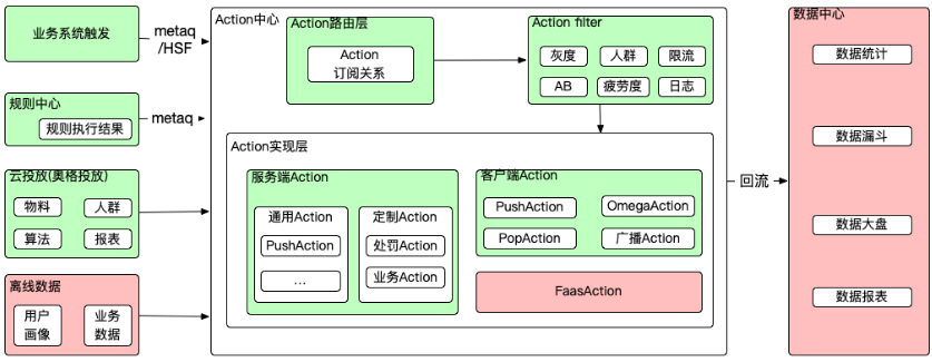 - Action过滤层根据一定策略过滤有效Action列表,过滤策略包括黑/白名单,灰度、人群和疲劳度策略;