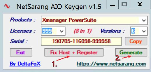 进入Keygen,点击注册机可执行程序,会弹出如下窗口,先点击 "Fix Host + Register",打下补丁,然后点击 “Generrate”,生成注册码