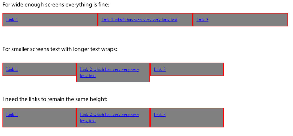 How can I make the links stay the same height (the 3rd example in my image below)? Ideally the entire area thats grey in my example would be a clickable link.