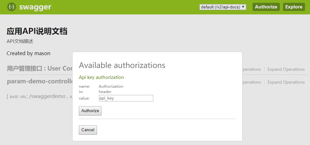 设置认证模式,并使用正则式对需要认证的接口进行筛选,这样swagger界面提供统一的认证界面。如下: