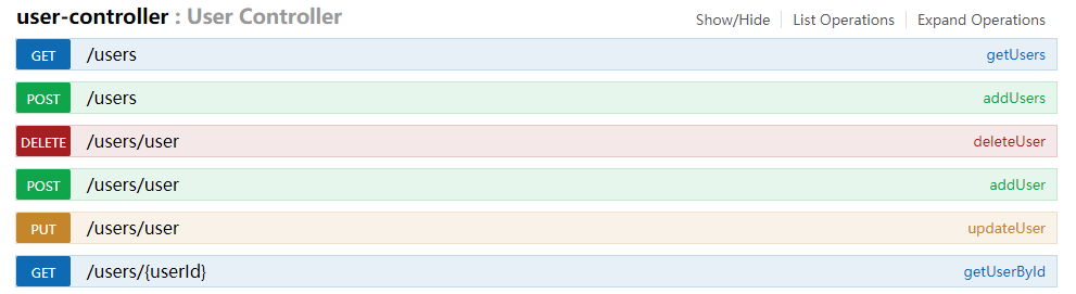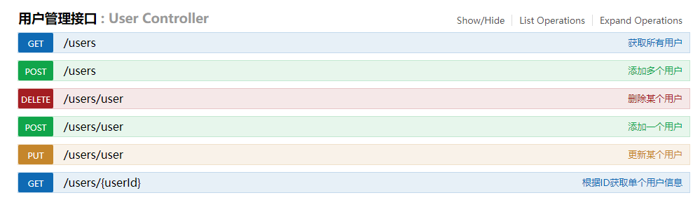 针对用户管理,使用restful风格的接口,定义了对用户的增删改查,对应(POST,DELETE,PUT,GET请求),如下: