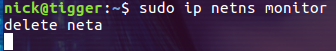 ip netns monitor 命令用来监控对 network namespace 的操作。比如我们删除一个 network namespace 时就会收到相应的通知: