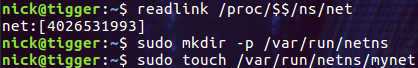 $ sudo mkdir -p /var/run/netns $ sudo touch /var/run/netns/mynet