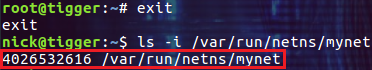 通过 ls -I 命令可以看到文件 mynet 的 inode 号和 network namespace 的 ID 相同,说明绑定成功: