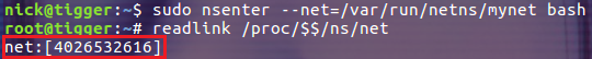 $ sudo nsenter --net=/var/run/netns/mynet bash # readlink /proc/$$/ns/net