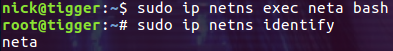$ sudo ip netns add net0 $ sudo ip link set dev eth0 netns net0 $ sudo ip netns exec net0 bash