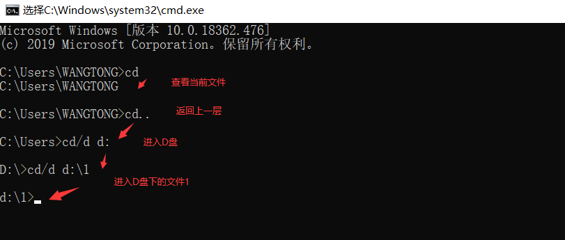 例:cd D\1\2 进入当前目录下的D/1 /2文件夹