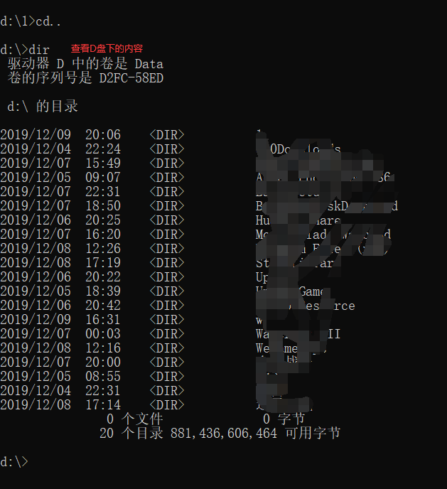 例:cd/d D: 进入上次D盘所在目录(或者直接输入:d:)