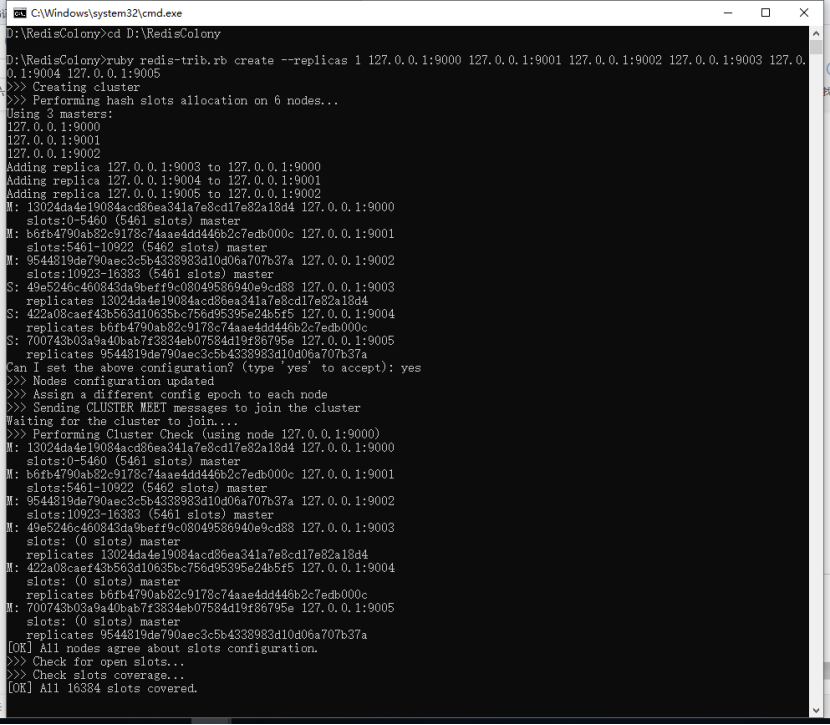 ruby redis-trib.rb create --replicas 1 127.0.0.1:9000 127.0.0.1:9001 127.0.0.1:9002 127.0.0.1:9003 127.0.0.1:9004 127.0.0.1:9005