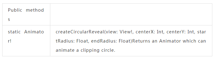AndroidPlatform 的 android.view 包下有个 ViewAnimationUtils 类,这是使用系统所提供揭露动画的唯一入口,其对外暴露的唯一接口如下: