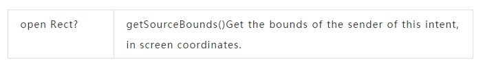 方法里的判断有个条件:intent?.sourceBounds == null,这里的 intent?.sourceBounds 是什么东西?其实在当前应用内,为 Activity 间切换时应用揭露动画效果完全可以不判断这个条件,此代码是写给文章最后才会聊到的整个 App 的揭露效果(上面 App 的揭露效果那张图)的。Intent 类里面有个方法签名如下: