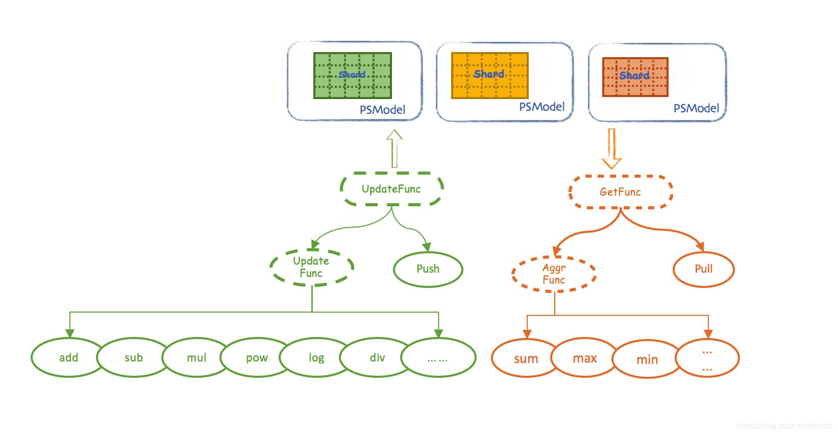 psFunc:为了满足各类算法对参数服务器的特殊需求,Angel将参数获取和更新过程进行了抽象,提供了psf函数功能。用户只需要继承Angel提供的psf函数接口,并实现自己的参数获取/更新逻辑,就可以在不修改Angel自身代码的情况下定制自己想要的参数服务器的接口。
