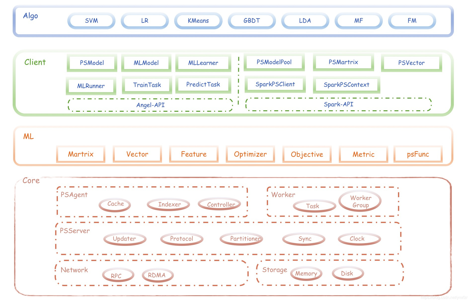 Angel是面向机器学习的,所以机器学习相关的元素也加入到core层,只是在一个单独的目录下