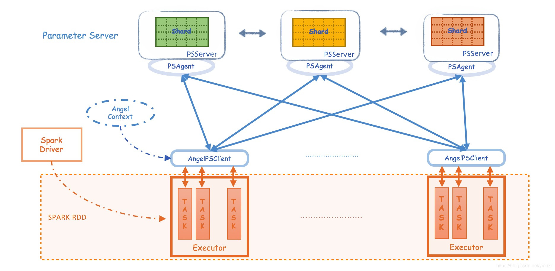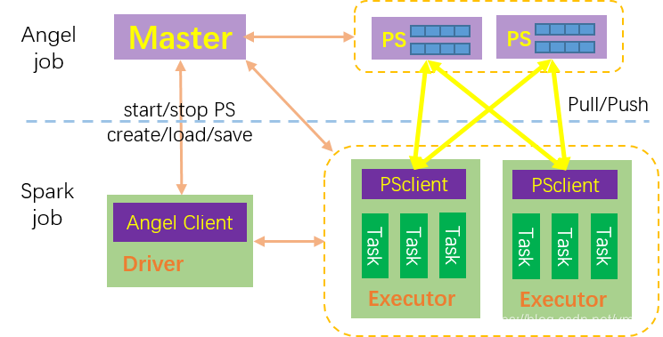 Angel_PS_service:PS Service模式,在这种模式下,Angel只启动Master和PS,具体的计算交给其他计算平台(如Spark,TensorFlow)负责,Angel只负责提供Parameter Server的功能