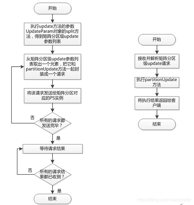 梯度更新:梯度更新在PS上进行,只要发送一个梯度更新的PSF即可,因此只需一个worker发送(Spark on Angel中是通过Driver发送)。不同的优化器的更新方式不一样,在angel中,优化器的核心本质是一个PSF。参数更新前要做一次同步,保证所有的梯度都推送完成,参数更新完成也要做一次同步,保证所有worker拉取的参数是最新的,参数更新完成后状态被设成update