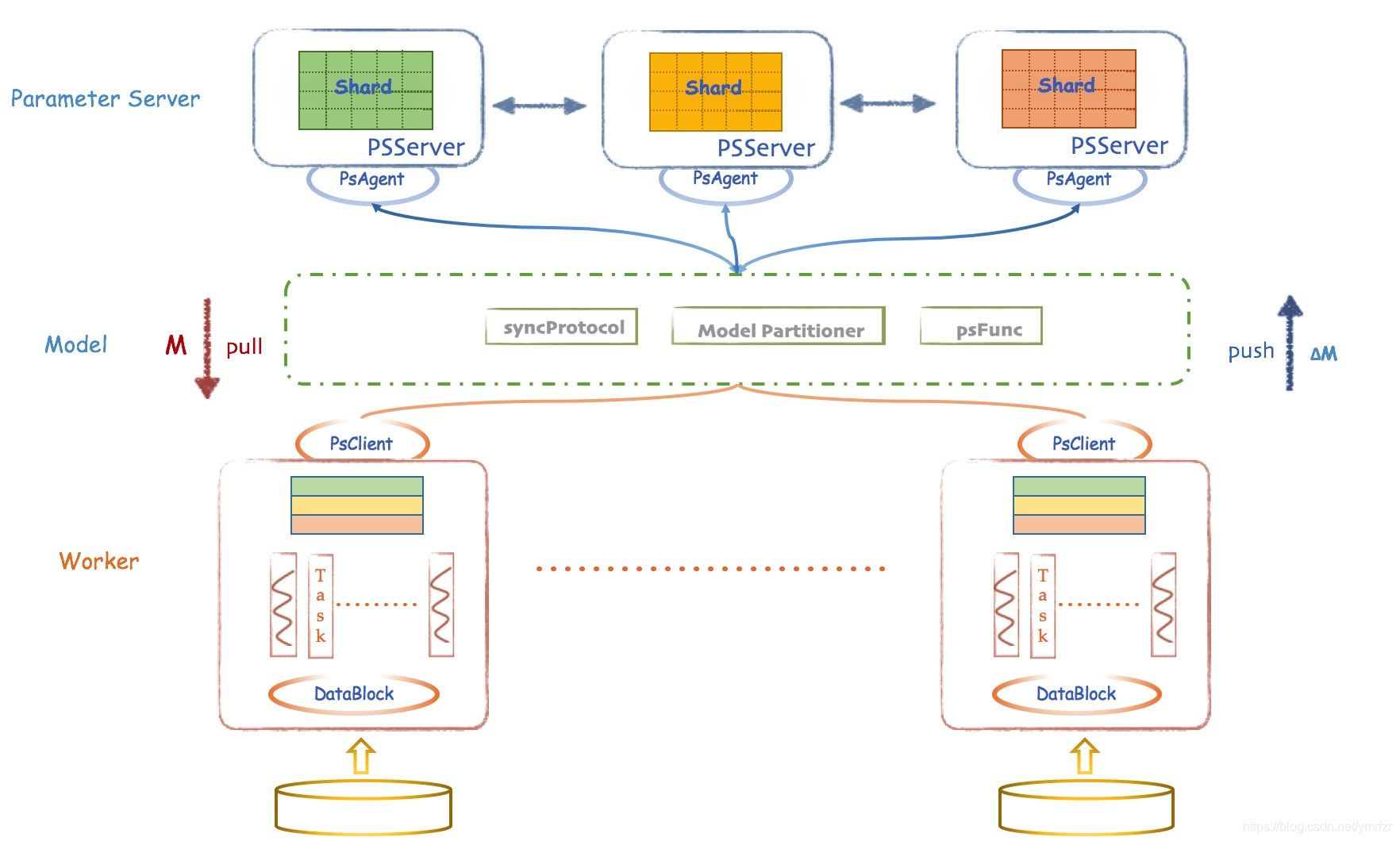 1、 Parameter Server层:提供通用的参数服务器服务,负责模型的分布存储,通讯同步和协调计算,并通过PSAgent提供PS Service