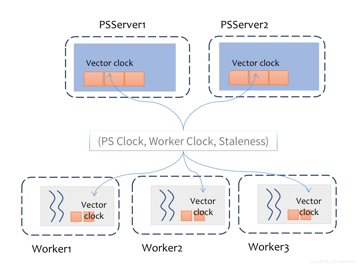 机器学习的算法,一般以迭代的方式训练,每次迭代worker从PS拉取最新的参数,计算一个更新值,推送给PS