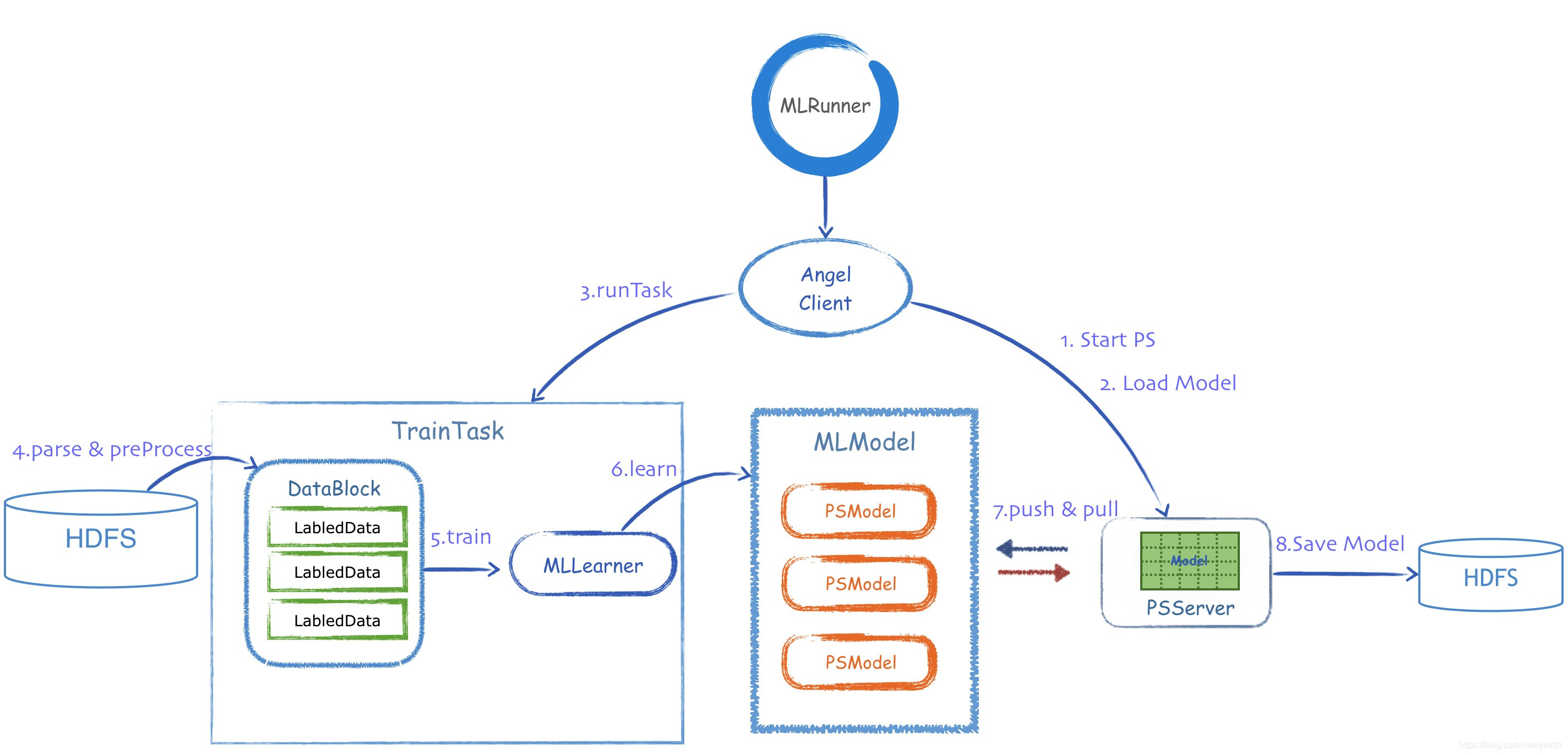 MLLearner调用自己的Learn方法,不断读取DataBlock,计算出模型的更新,并通过MLModel中的PSModel,和PSServer进行不停的Push和Pull,最终得到一个完整的MLModel