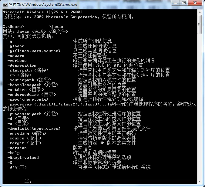 在命令窗口中,输入java命令:javac,回车,如果出现如下信息,说明安装成功。