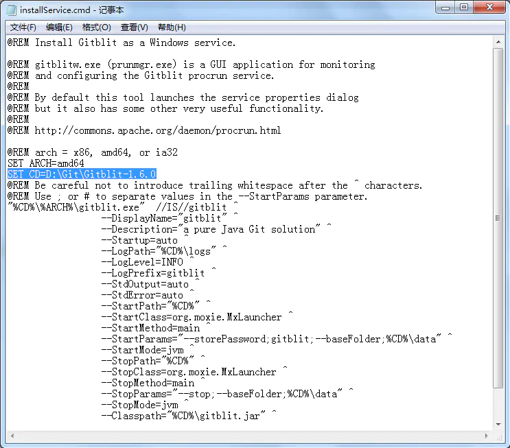 SET CD=D:\Git\Gitblit-1.6.0(你的实际目录)