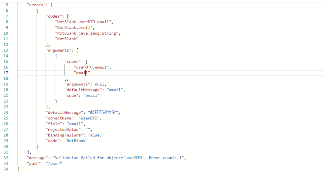 这样是能校验成功,但是有个问题就是返回参数并不理想,前端也并不容易处理返回参数,所以我们添加一下全局异常处理,然后添加一下全局统一返回参数这样比较规范。