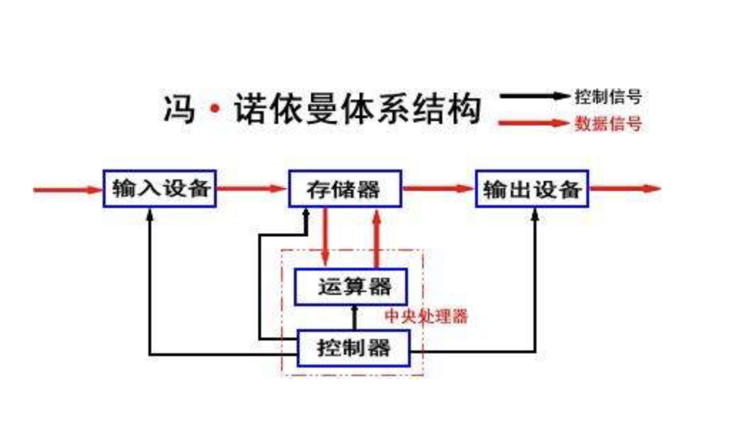 冯诺依曼体系由四大块组成:运算和控制构成了中央处理器,另外的三个组成部分是输入、存储和输出。