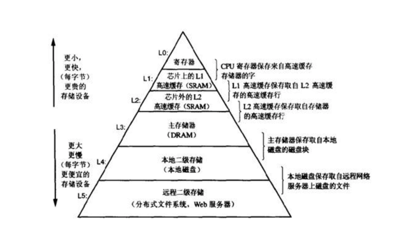 最上边寄存器的处理延迟约为1纳秒;L2的缓存延时约为10纳秒;L3 DRAM主存的延时约为60纳秒;L4 磁盘的延时约为5毫秒。