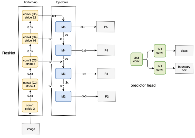 FPN会使用CNN网络中每一层的信息来生成最后的表达特征组合。下图是它的基本架构。从中我们能看到FPN会模型每个CNN层的特征输出进行处理以生成反映此维度信息的特征。而自上至下处理后所生成出的特征之间也有个关联关系,即上层high level的特征会影响下一层次的low level特征表达。最终所有的特征一起用来作为下一步的目标检测或类别分析等任务的输入。