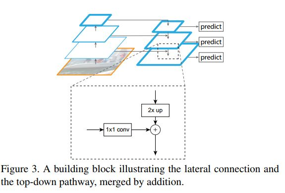 - CNN层特征与每一级别输出之间的表达关联(横向连接):在这里作者实验表明使用1x1的Conv即可生成较好的输出特征,它可有效地降低中间层次的channels 数目。最终这些1x1的Convs使得我们输出不同维度的各个feature maps有着相同的channels数目(本文用到的Resnet-101主干网络中,各个层次特征的最终输出channels数目为256)。