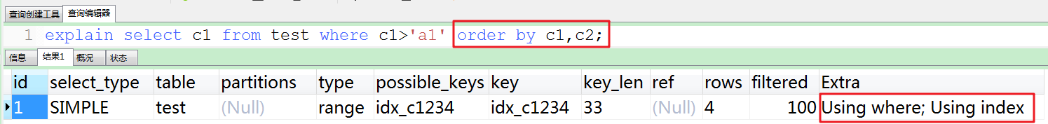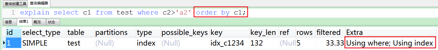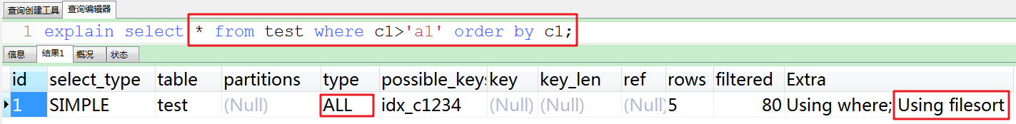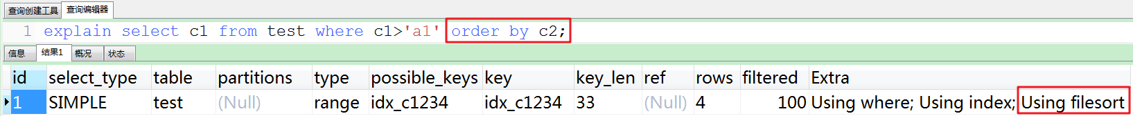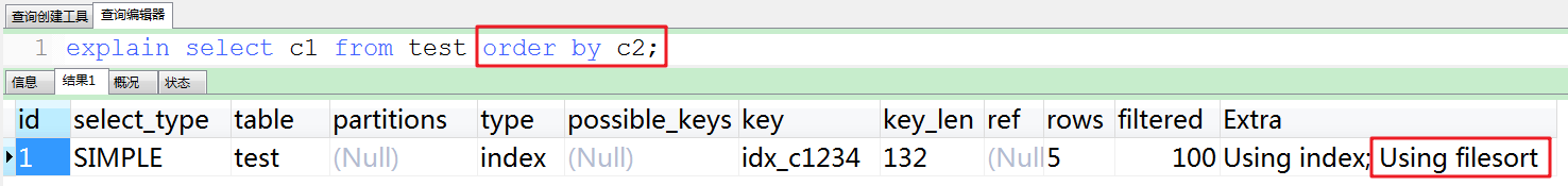 前言:在使用order by时,经常出现Using filesort,因此对于此类sql语句需尽力优化,使其尽量使用Using index。