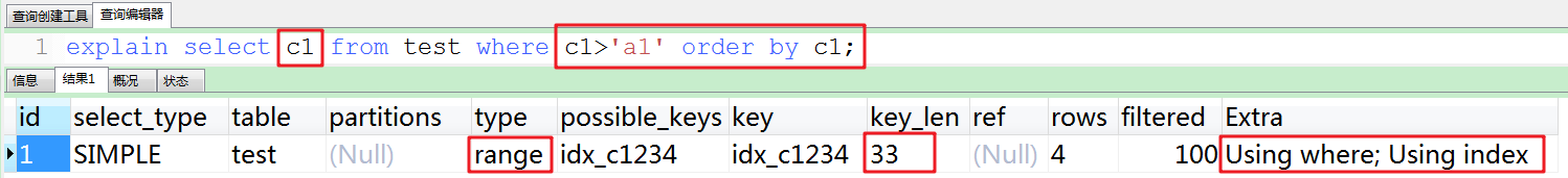 ①在c1,c2,c3,c4上创建了索引,直接在c1上使用范围,导致了索引失效,全表扫描:type=ALL,ref=Null。因为此时c1主要用于排序,并不是查询。
