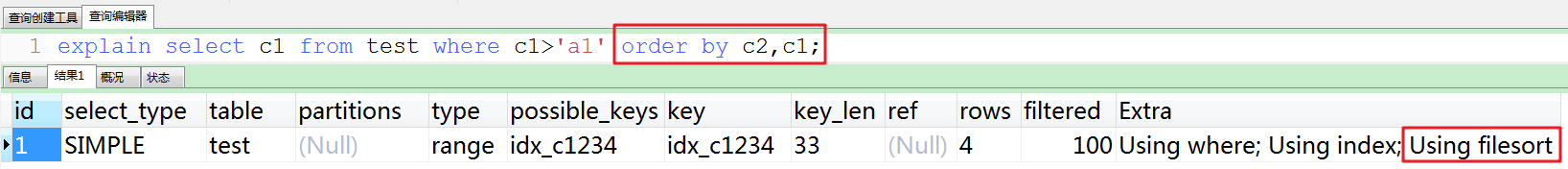 ②使用c1进行排序,出现了Using filesort。