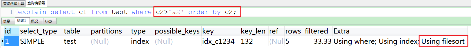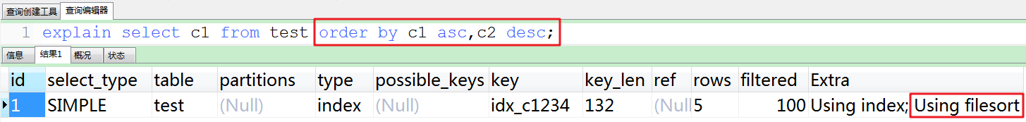 虽然排序的字段列与索引顺序一样,且order by默认升序,这里c2 desc变成了降序,导致与索引的排序方式不同,从而产生Using filesort。