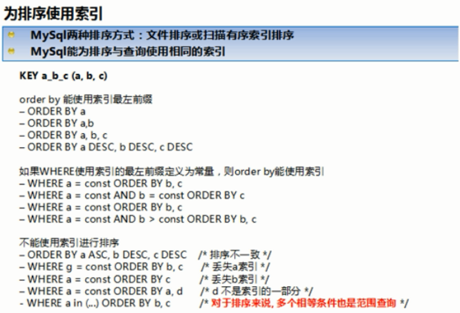 ①MySQL支持两种方式的排序filesort和index,Using index是指MySQL扫描索引本身完成排序。index效率高,filesort效率低。