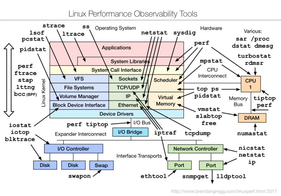 下面的图片很好的展示了各个命令的主要作用,如使用vmstat查看系统的整体性能,mpstat用于查看cpu的性能,pidstat用于查看进程的状态,iostat用于查看io的状态,free用于产看内存的状态,sar用于产看网络的状态等。