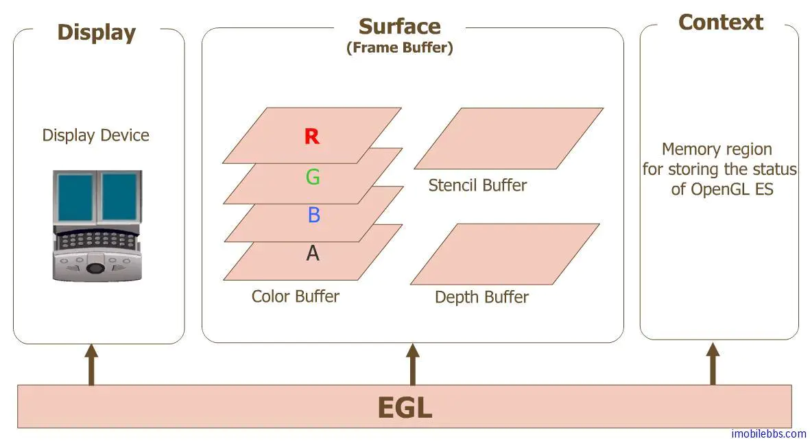 - Surface(EGLSurface)是对用来存储图像的内存区域 FrameBuffer 的抽象,包括 Color Buffer, Stencil Buffer ,Depth Buffer。