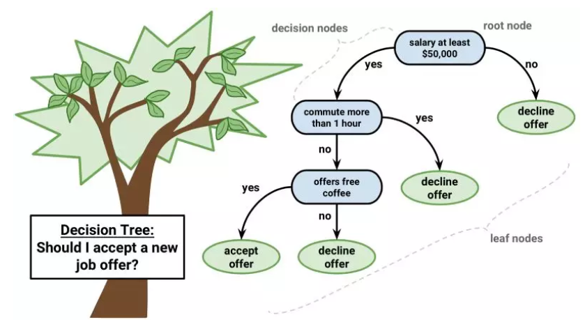 决策树的叶子结点包含一个用于做出预测的输出变量(y)。预测结果是通过在树的各个分叉路径上游走,直到到达一个叶子结点并输出该叶子结点的类别值而得出。