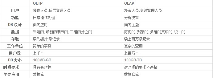 数据处理大致可以分成两大类:联机事务处理OLTP(on-line transaction processing)、联机分析处理OLAP(On-Line Analytical Processing)。OLTP是传统的关系型数据库的主要应用,主要是基本的、日常的事务处理,例如银行交易。OLAP是数据仓库系统的主要应用,支 持复杂的分析操作,侧重决策支持,并且提供直观易懂的查询结果。