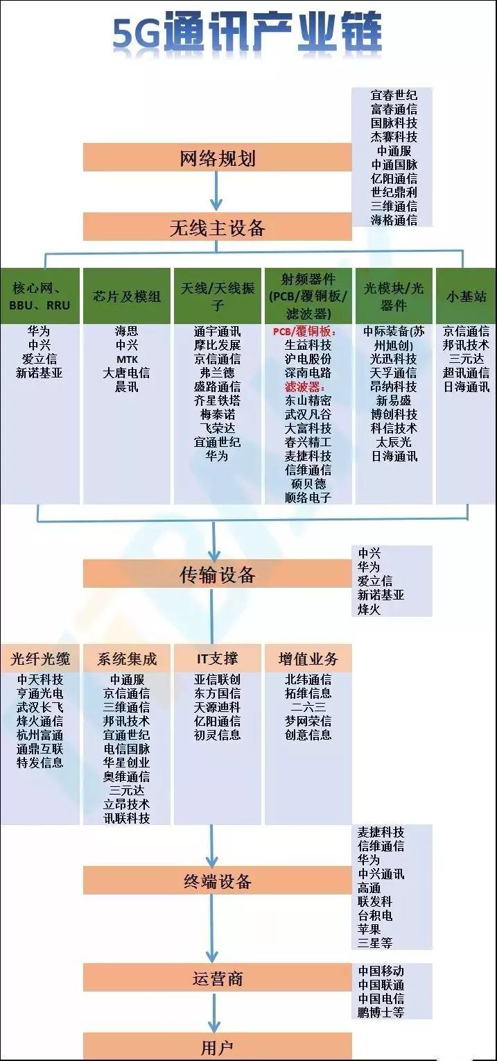 由上图,5G通信行业产业链条主要包括以下五个重要环节: