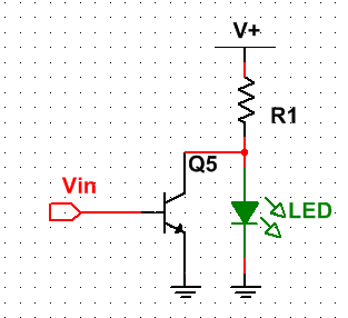 当Vin没有电流,Q5断开时,LED亮。当Vin流入电流,Q5导通时,LED灭。