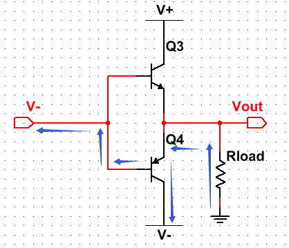 当Vin电压为V+时,上面的N型三极管控制端有电流输入,Q3导通,于是电流从上往下通过,提供电流给负载。