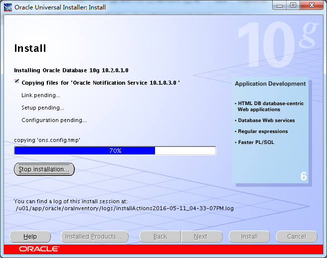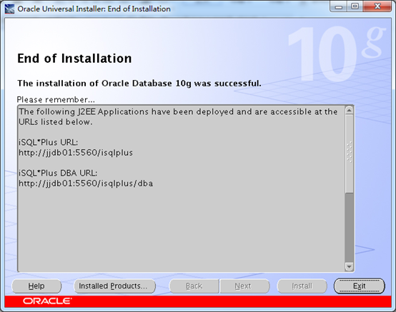 至此oracle10g的数据库已经装好了可以自己建个用户用sqlplus username/passwd@ora10g 进行连接验证,如果能正常连接到数据库,那说明数据库搭建成功了!