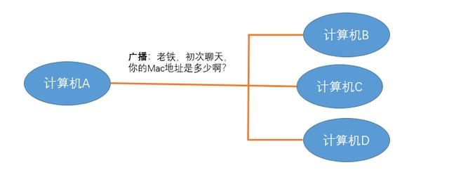 如图,假如计算机 A 知道了计算机 B 的 MAC 地址,然后计算机 A 想要给计算机 B 传送数据,虽然计算机 A 知道了计算机 B 的 MAC 地址,可是它要怎么给它传送数据呢?计算机 A 不仅连着计算机 B,而且计算机 A 也还连着其他的计算机。 虽然计算机 A 知道计算机 B 的 MAC 地址,可是计算机 A 却不知道知道计算机 B 是分布在哪边路线上,为了解决这个问题,于是,有了广播的出现。