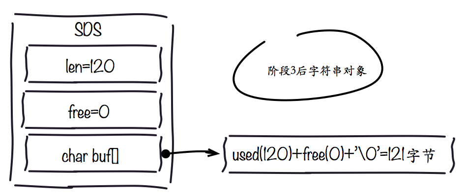 从测试数据可以看出,同样的数据追加后内存消耗非常严重,下面我们结合图来分析这一现象。阶段1每个字符串对象空间占用如下图所示。