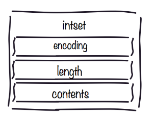 以上命令可以看出intset对写入整数进行排序,通过O(log(n))时间复杂度实现查找和去重操作,intset编码结构如下图所示。