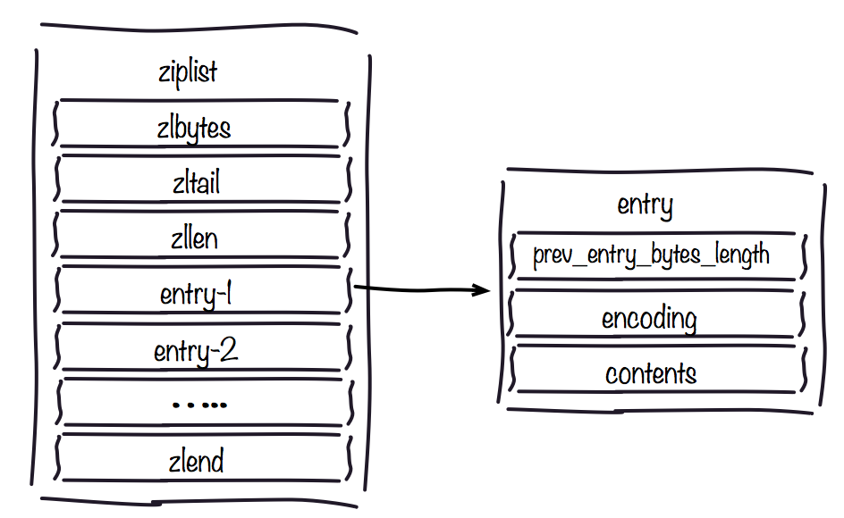 ziplist编码主要目的是为了节约内存,因此所有数据都是采用线性连续的内存结构。ziplist编码是应用范围最广的一种,可以分别作为hash、list、zset类型的底层数据结构实现。首先从ziplist编码结构开始分析,它的内部结构类似这样:<….>。一个ziplist可以包含多个entry(元素),每个entry保存具体的数据(整数或者字节数组),内部结构如下图所示。