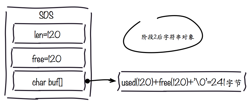 - 2) 修改后如果已有free空间不够且数据小于1M,每次预分配一倍容量。如原有len=60byte,free=0,再追加60byte,预分配120byte,总占用空间:60byte+60byte+120byte+1byte。