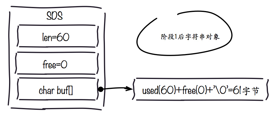 阶段1插入新的字符串后,free字段保留空间为0,总占用空间=实际占用空间+1字节,最后1字节保存‘\0’标示结尾,这里忽略int类型len和free字段消耗的8字节。在阶段1原有字符串上追加60字节数据空间占用如下图所示。
