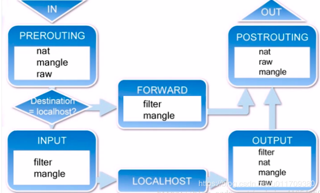 filter:包过滤,用于防火墙规则。有INPUT、FORWARD、OUTPUT三个链